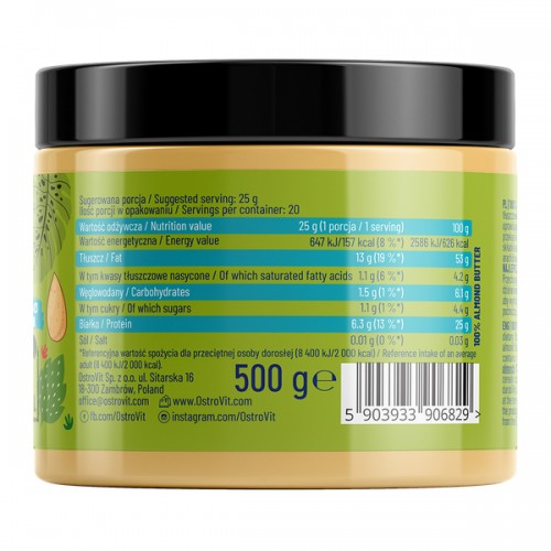 100% натуральне мигдальне масло, цей продукт виготовлений для спортсменів, які хочуть обмежити споживання цукру і солі у своєму раціоні. Він містить цінні жирні кислоти. Чистий, мигдальний смак ідеально підходить як до солодких так і для солоних продуктів. Прекрасна альтернатива для людей з алергією на арахіс. Продукт включає в себе дієтичне волокно, а також невеликі кількості калію, заліза і марганцю. Є джерелом фосфору, міді, вітаміну Е і клітковини. Не містить штучних барвників, ароматизаторів та консервантів. Він містить хороші жири, необхідні для здорового харчування.