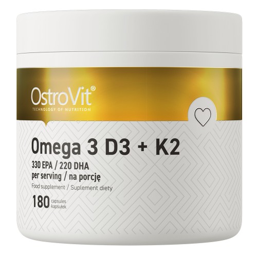 OstroVit Omega 3 D3 + K2 - дієтична добавка в капсулах м'якого типу, що містить жирні кислоти Омега 3 (EPA і DHA) та вітаміни D3, K2, а також D-альфа-токоферол (вітамін E). Особливо OstroVit Omega 3 D3 + K2 рекомендується людям, які хочуть забезпечити належне функціонування серцево-судинної системи, а також тим, хто хоче забезпечити правильну роботу кісток.